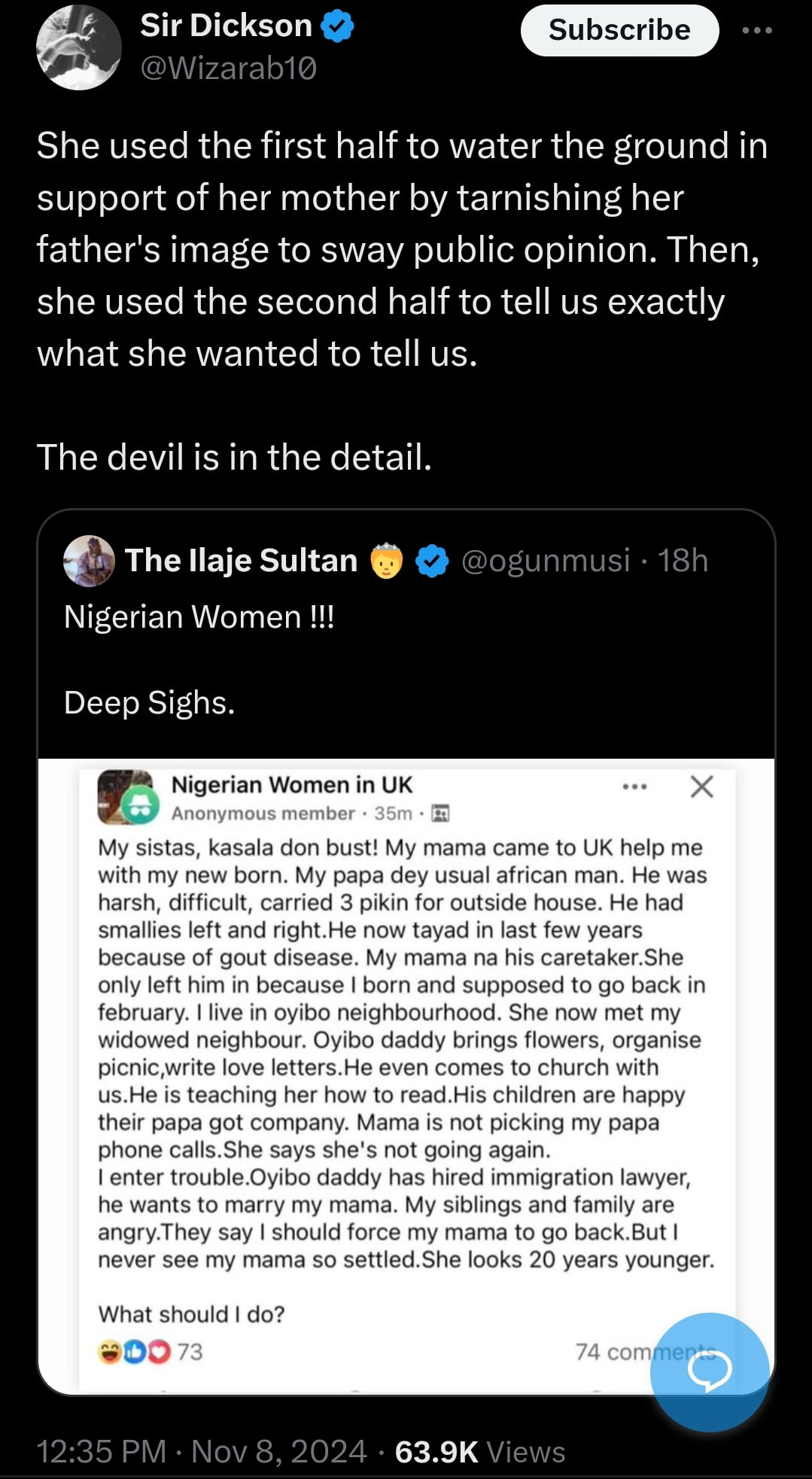 “My sisters, there’s trouble!” she wrote. “My mother came to the UK to help me with my newborn. My father, like the typical African man, has always been harsh and difficult. He has three children outside our family and was known for his affairs. Recently, he’s been struggling with health issues, and my mother has been caring for him. She only left to help me with my newborn, planning to return in February.”