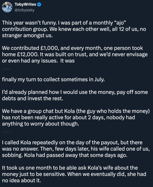 “This year wasn’t funny. I was part of a monthly “ajo” contribution group. We knew each other well, all 12 of us, no stranger amongst us.