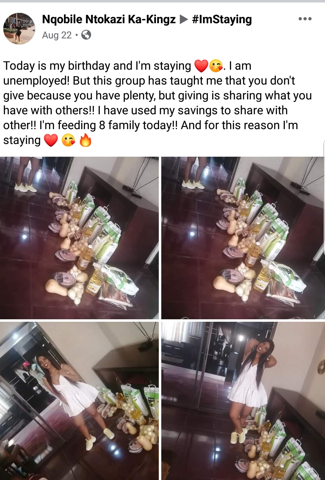 “Today is my birthday and I’m staying ❤️?. I am unemployed! But this group has taught me that you don’t give because you have plenty, but giving is sharing what you have with others!! I have used my savings to share with other!! I’m feeding 8 family today!! And for this reason I’m staying ❤️ ? ?”,she captioned the photos.