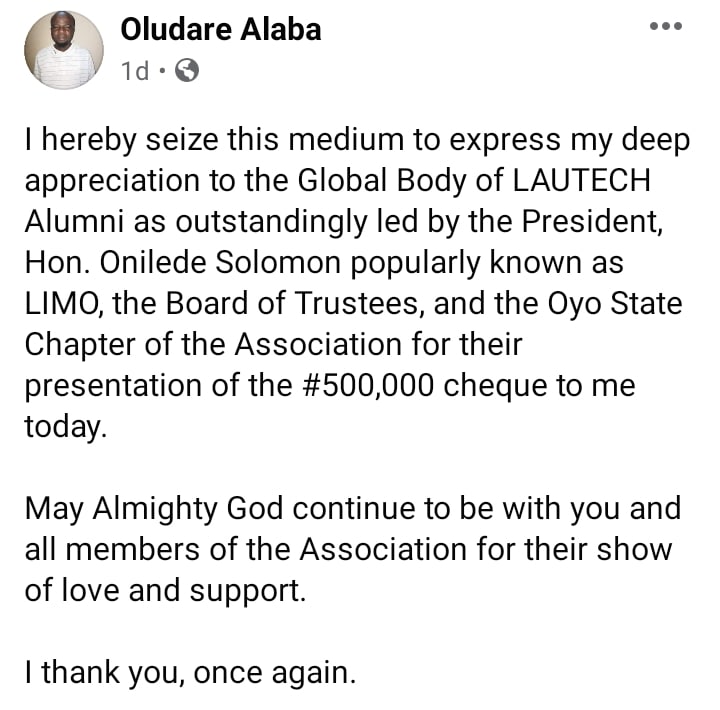 “I hereby seize this medium to express my deep appreciation to the Global Body of LAUTECH Alumni as outstandingly led by the President, Hon. Onilede Solomon popularly known as LIMO, the Board of Trustees, and the Oyo State Chapter of the Association for their presentation of the #500,000 cheque to me.