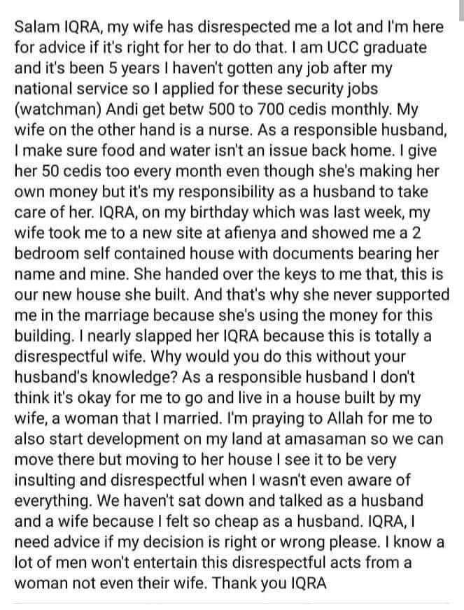 A Ghanaian man has recounted how he chastised his wife for building a new two-bedroom home for them with her own resources behind his back.