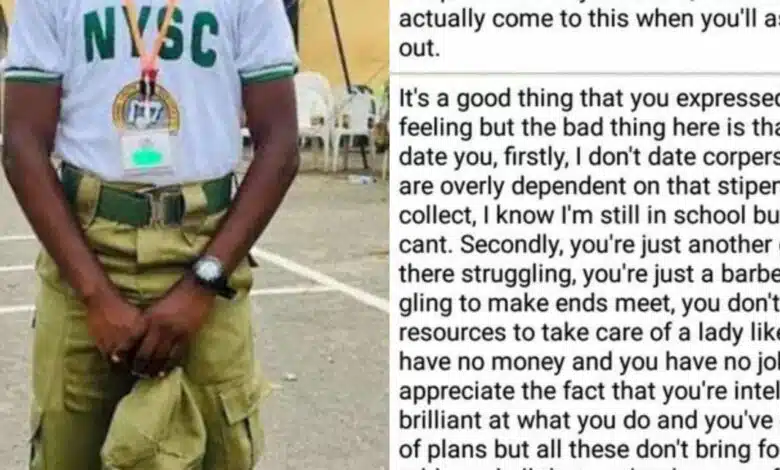 Uni student turns down Youth Corper because he ‘doesn’t have resources to take care of girl like her’