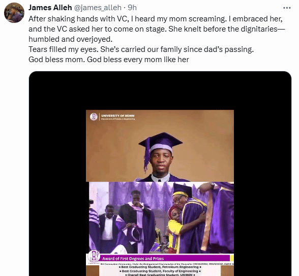 UNIBEN’s best-graduating student, James Alleh opens up on his mom’s sacrifice for their family as she’s honored at his graduation ceremony.