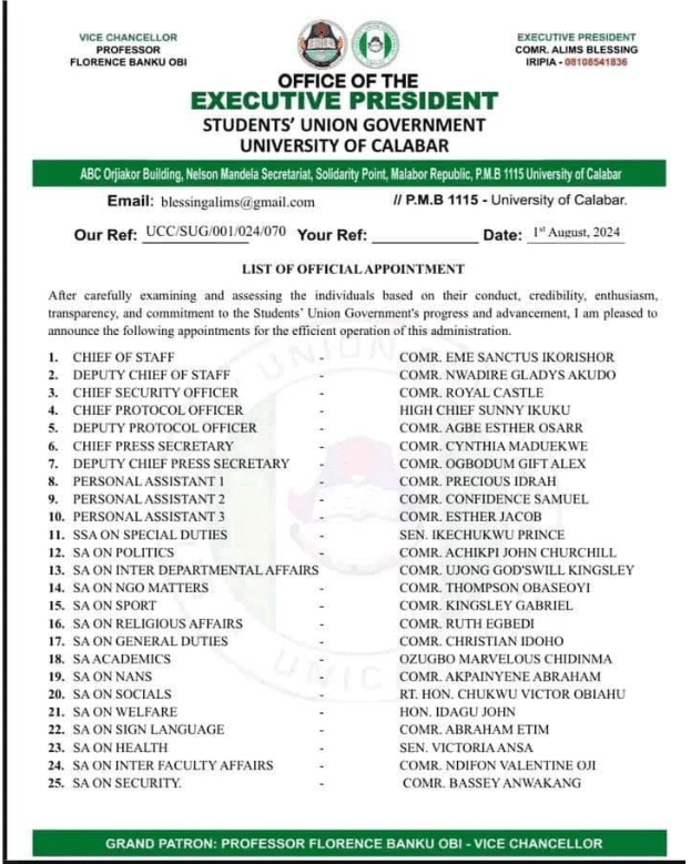 “After carefully examining and assessing the following individuals based on their conduct, credibility, enthusiasm, transparency, and commitment to the Students’ Union Government’s progress and advancement, I am pleased to announce the following appointments for the efficient operation of Blessing_Alims_Led_Administration,” she wrote.