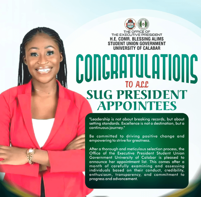 The newly elected President of the Student Union Government (SUG) at the University of Calabar (UNICAL), Alims Blessing Iripia, has caused serious buzz online with her announcement of the appointment of 50 aides to support her administration.