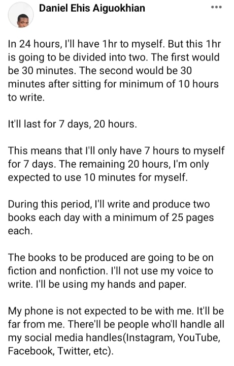 “During this period, I’ll write and produce two books each day with a minimum of 25 pages each. The books to be produced are going to be on fiction and nonfiction. I’ll not use my voice to write. I’ll be using my hands and paper.