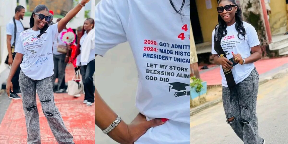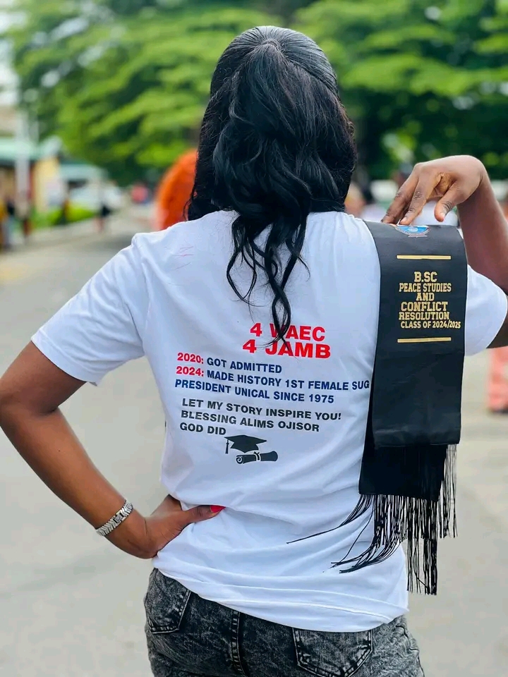 The lady, identified as Blessing Alims on Facebook, expressed enthusiasm over completing her Bachelor of Science (BSc) in Peace Studies and Conflict Resolution.