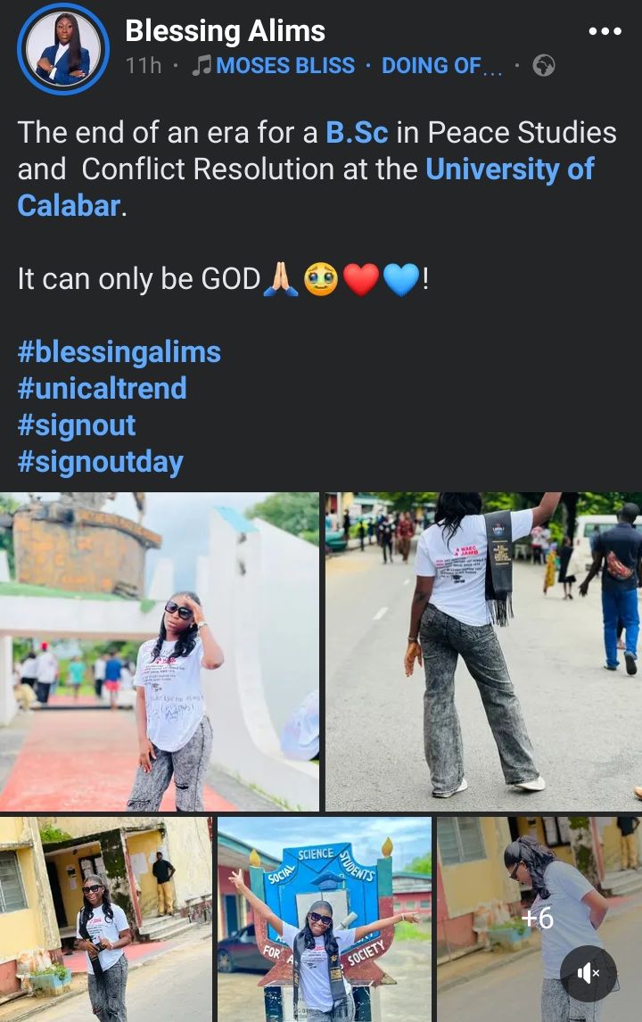 Her post reads,“The end of an era for a B.Sc in Peace Studies and Conflict Resolution at the University of Calabar.It can only be GOD🙏🏻🥹❤️💙”.