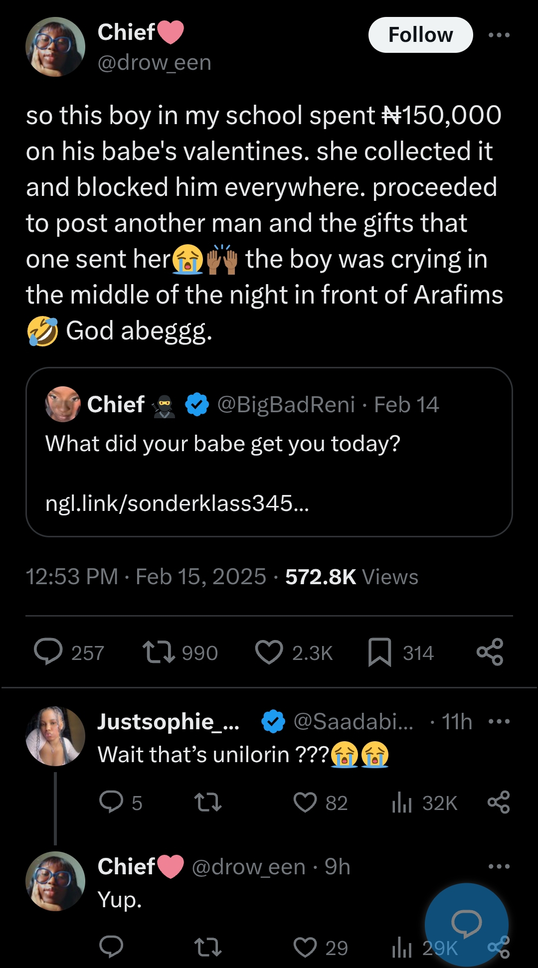 “So this boy in my school spent ₦150,000 on his babe’s Valentine’s gift. She took everything, blocked him everywhere, and then posted another man along with the gifts he sent her.😭🙌🏾 The boy was crying in the middle of the night in front of Arafims🤣 God abeggg.”