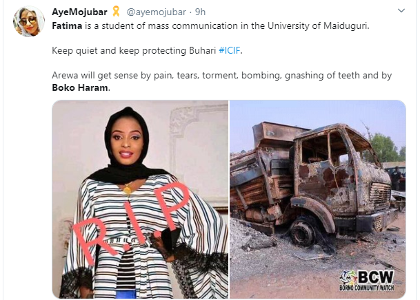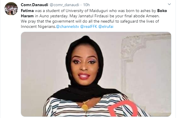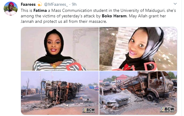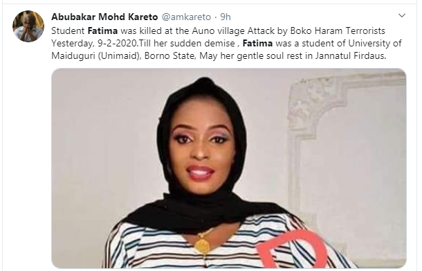 A University of Maiduguri Mass Communication student, Fatima has been identified as one of the 30 people killed by Boko Haram terrorists in an attack launched in Auno village, Borno on Sunday February 11.