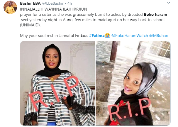 According to reports, Fatima was burnt to death by the insurgents who also abducted many women and children in the attack which occurred while she was on her way back to school.