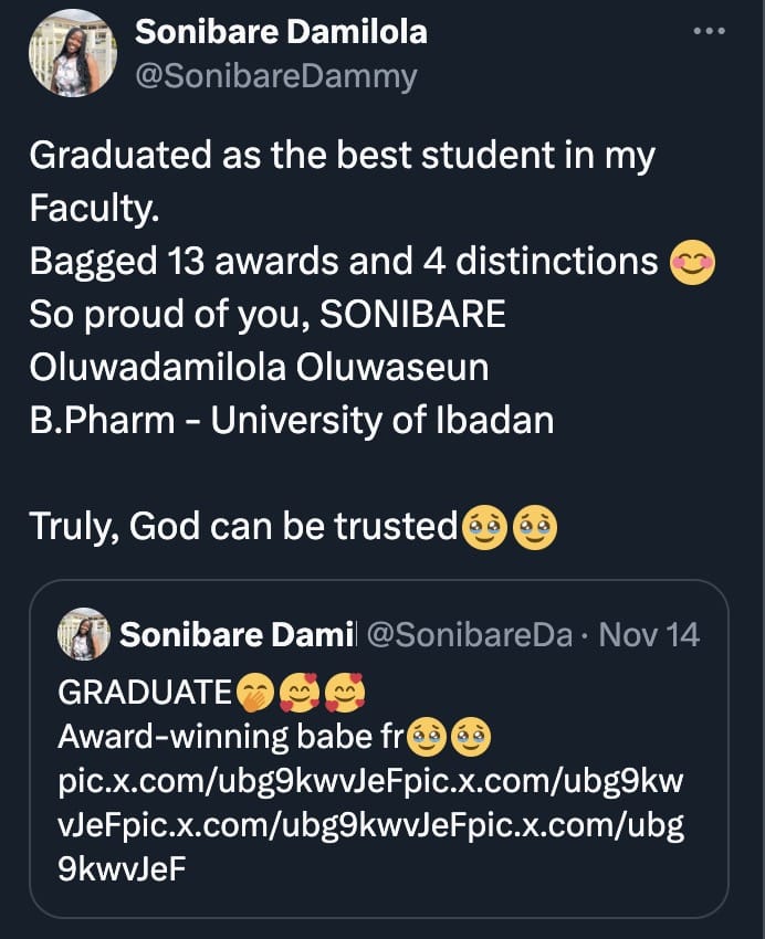 A University of Ibadan (UI) graduate, Sonibare Oluwadamilola Oluwaseun, has captured widespread admiration after excelling in her academic pursuit.