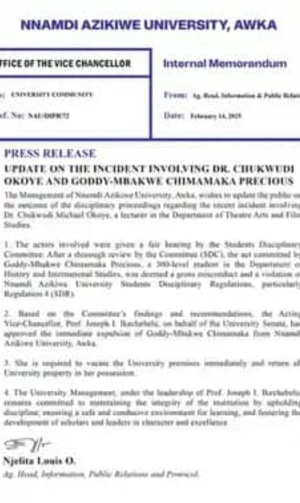 The management of Nnamdi Azikiwe University (UNIZIK) has addressed the expulsion of Precious Mbakwe, the female student involved in a physical altercation with a lecturer.
