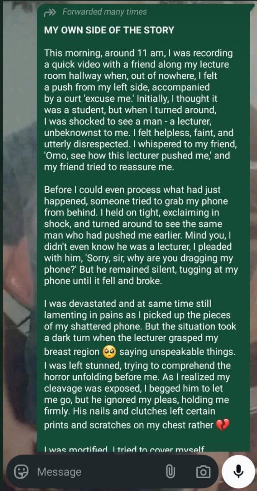 “I was devastated and still lamenting in pain as I picked up the pieces of my shattered phone. But the situation took a dark turn when the lecturer grasped my breast region, saying unspeakable things. I was left stunned, trying to comprehend the horror unfolding before me.”