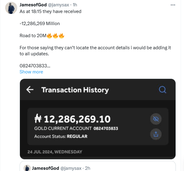 @jamysax recently took to his X page to give a 18:15 update, revealing the money to be 12,286,269 Million as of that time.