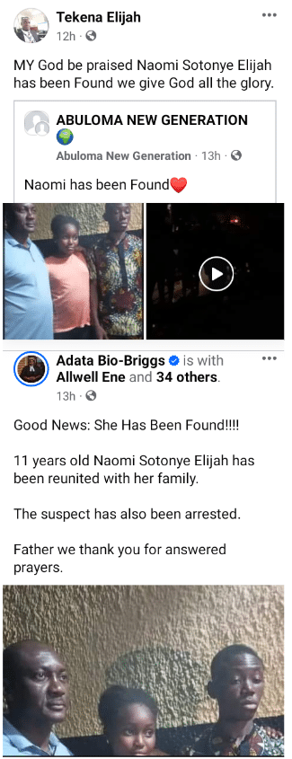 A 11-year-old girl, Naomi Sotonye Elijah, who went missing on Saturday, November 25, 2023, in Port Harcourt, Rivers State, has been found safe and sound.