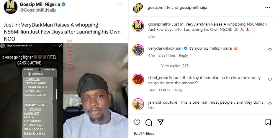 Popular influencer, Verydarkman gives update on his crowdfunding as he reveals that he has raised a whooping N62M for his new NGO.