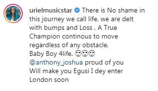 “There is No shame in this journey we call life, we are delt with bumps and Loss , A True Champion continuous to move regardless of any obstacle. Baby Boy 4life. @anthony_joshua proud of you. Will make you Egusi I dey enter London soon”