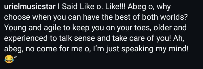 Her post read, “I said, like, oo. Abeg oo, why choose when you can have the best of both worlds? Young and agile to keep you on your toes, older and experienced to talk sense and take care of you. Abeg, no come for me ooo, I’m just speaking my mind”.