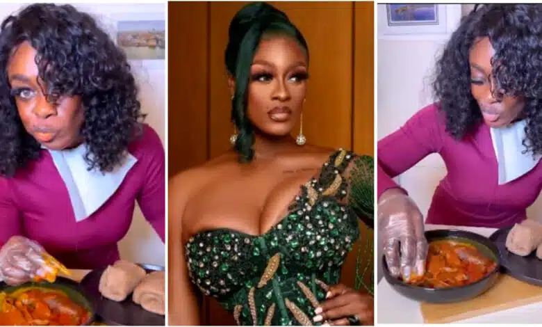 Uriel Oputa shares video eating swallow with gloves, Fans drag her
