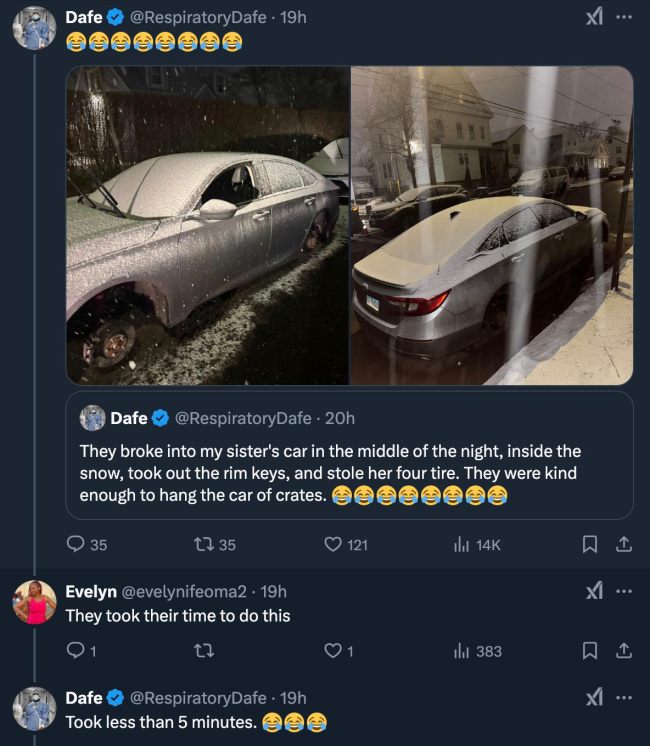 “They broke into my sister’s car in the middle of the night, inside the snow, took out the rim keys, and stole her four tires. They were kind enough to hang the car on crates. 😂😂😂😂😂😂😂😂,” he wrote.