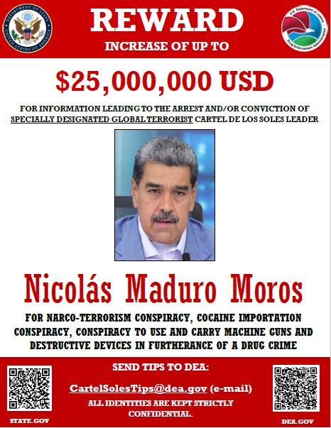 President Maduro carries a $25 million bounty, with the same amount placed on Cabello and $15 million on Padrino.