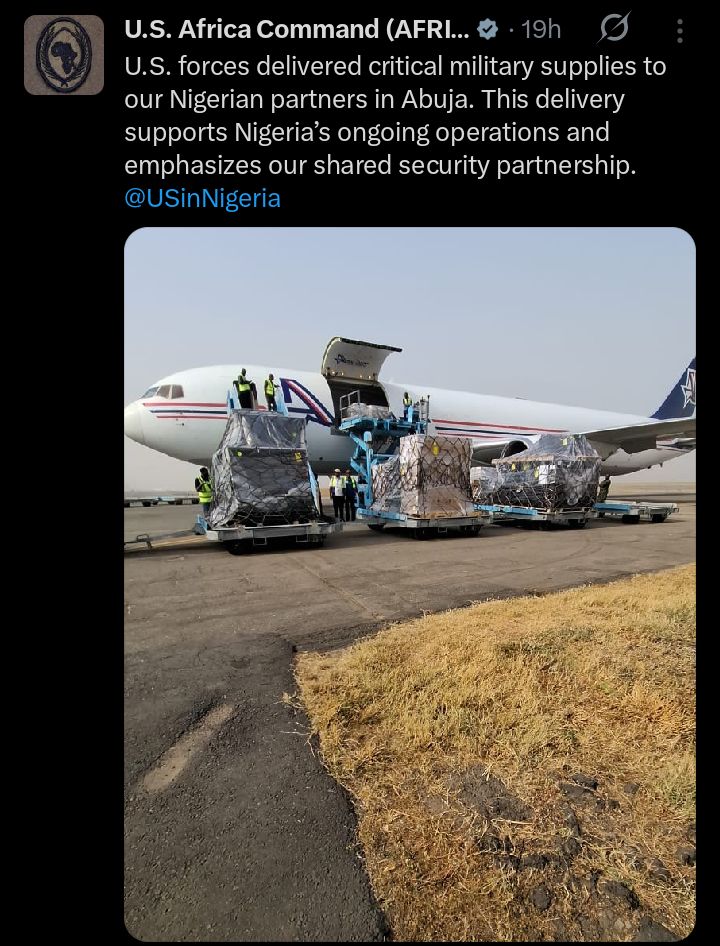 “U.S. forces delivered critical military supplies to our Nigerian partners in Abuja. This delivery supports Nigeria’s ongoing operations and emphasises our shared security partnership,” the command stated, tagging the U.S. Embassy in Nigeria, @USinNigeria.