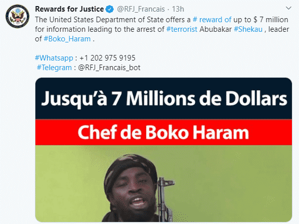 “The United States Department of State offers a #reward of up to $7 million for information leading to the arrest of #terrorist Abubakar #Shekau , leader of #Boko_Haram . #Whatsapp : +1 202 975 9195 #Telegram : @RFJ_Francais_bot”