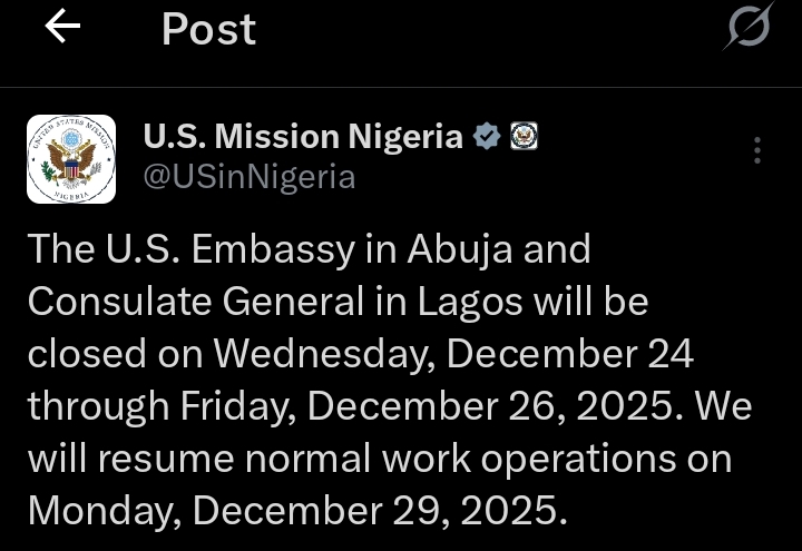 In the tweet dated December 23, 2025, it was announced that the Lagos consulate and US Embassy in Abuja will be closed effective December 24, 2025.