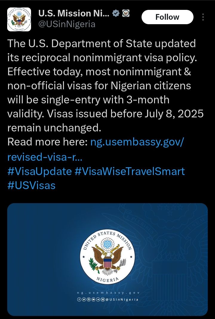 The US Embassy in Nigeria has introduced changes to its visa policy, effective July 8, 2025.