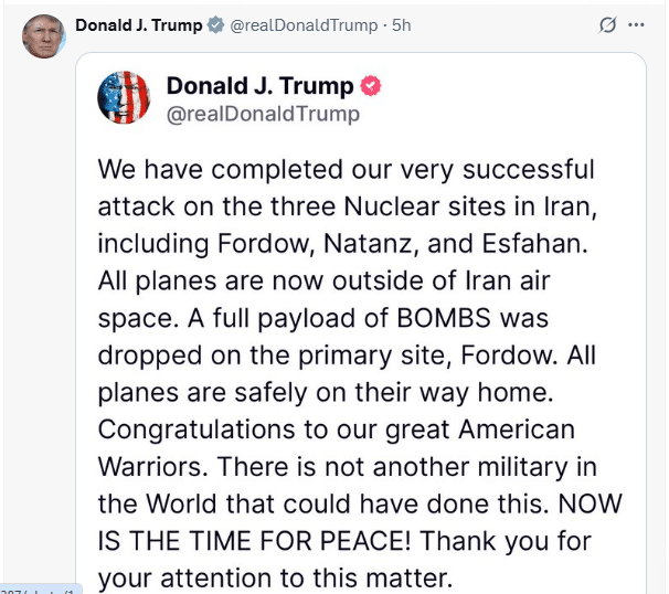 “We have completed our very successful attack on the three Nuclear sites in Iran, including Fordow, Natanz, and Esfahan. All planes are now outside of Iran air space. A full payload of BOMBS was dropped on the primary site, Fordow. All planes are safely on their way home. Congratulations to our great American Warriors. There is not another military in the World that could have done this. NOW IS THE TIME FOR PEACE!”