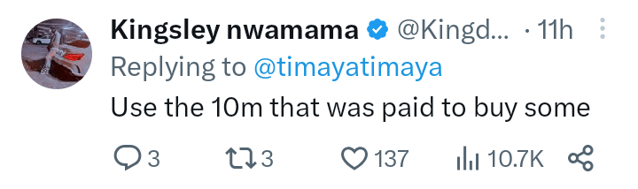 However, fans quickly responded to Timaya’s tweet, admonishing the singer and referencing the rumored payment of N10 million to musicians who performed at the event.