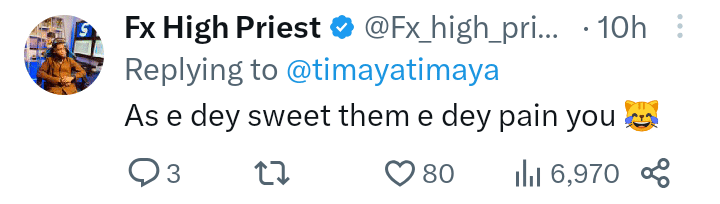Another user, @Fx_high_priest, cheekily remarked; “As e dey sweet them e dey pain you 😹.”