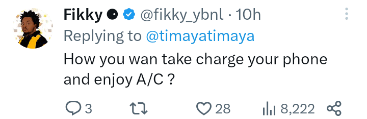@fikky_ybnl added; “How you wan take charge your phone and enjoy A/C ?”