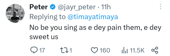 @jayr_peter commented; “No be you sing as e dey pain them, e dey sweet us”