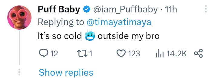 @iam_Puffbaby added; “It’s so cold 🥶 outside my bro”