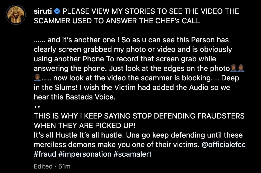 “PLEASE VIEW MY STORIES TO SEE THE VIDEO THE SCAMMER USED TO ANSWER THE CHEF’s CALL