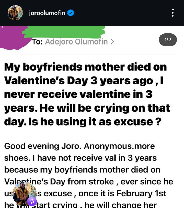 “My boyfriend’s mother died on Valentine’s Day three years ago. I have not received Valentine in three years because of that,” she wrote.