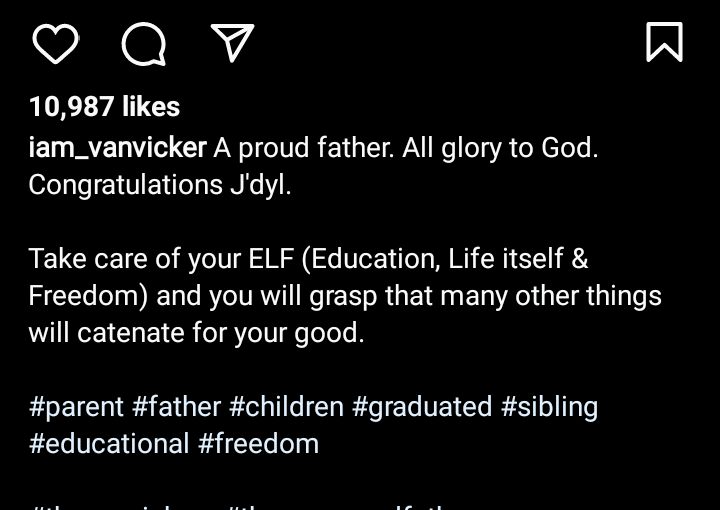 “A proud father. All glory to God. Congratulations J’dyl. Take care of your ELF (Education, Life itself & Freedom) and you will grasp that many other things will catenate for your good,” the actor wrote.