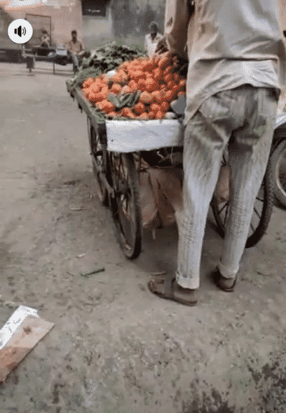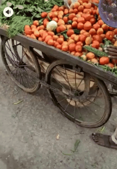 The vegetable seller, who sells his goods from a wheel barrow, had a minor accident and some of his vegetables fell into the gutter.