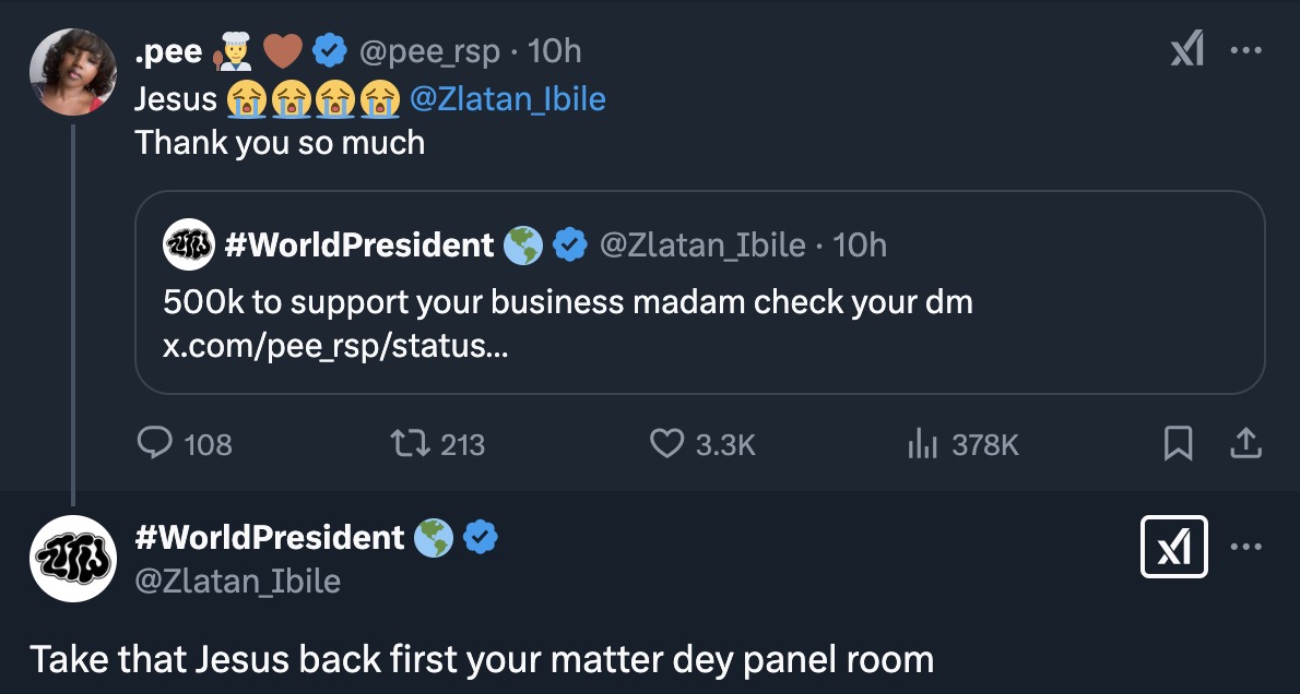 The incident unfolded after Zlatan announced a giveaway on his X platform, pledging N500K each to support small business owners who consistently advertise their work online.