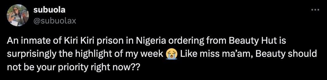 “An inmate of Kirikiri Prison in Nigeria ordering from Beauty Hut is surprisingly the highlight of my week. Like miss ma’am. Beauty shouldn’t be your priority right now?” she wrote.