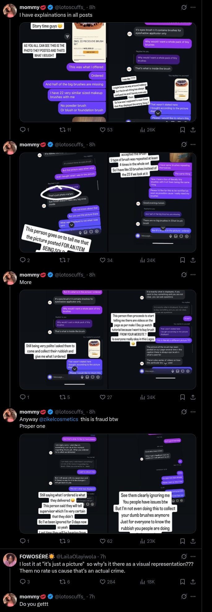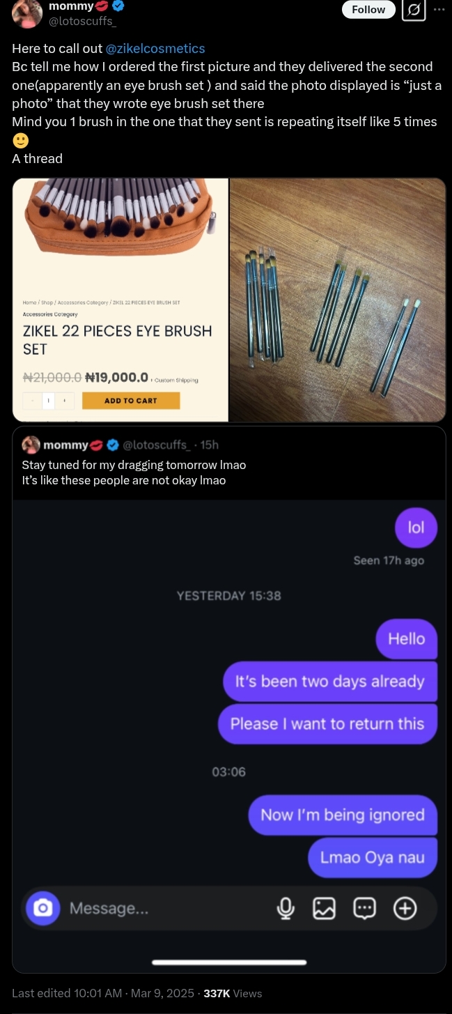 A dissatisfied lady has called out a vendor on social media after receiving an eye brush set different from what was advertised.