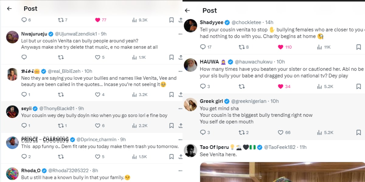 Neo’s post triggered a lot of reactions from Twitter users as many slammed Neo for ignoring to share his advice with his cousin Venita as many tagged the mother of two a bully.