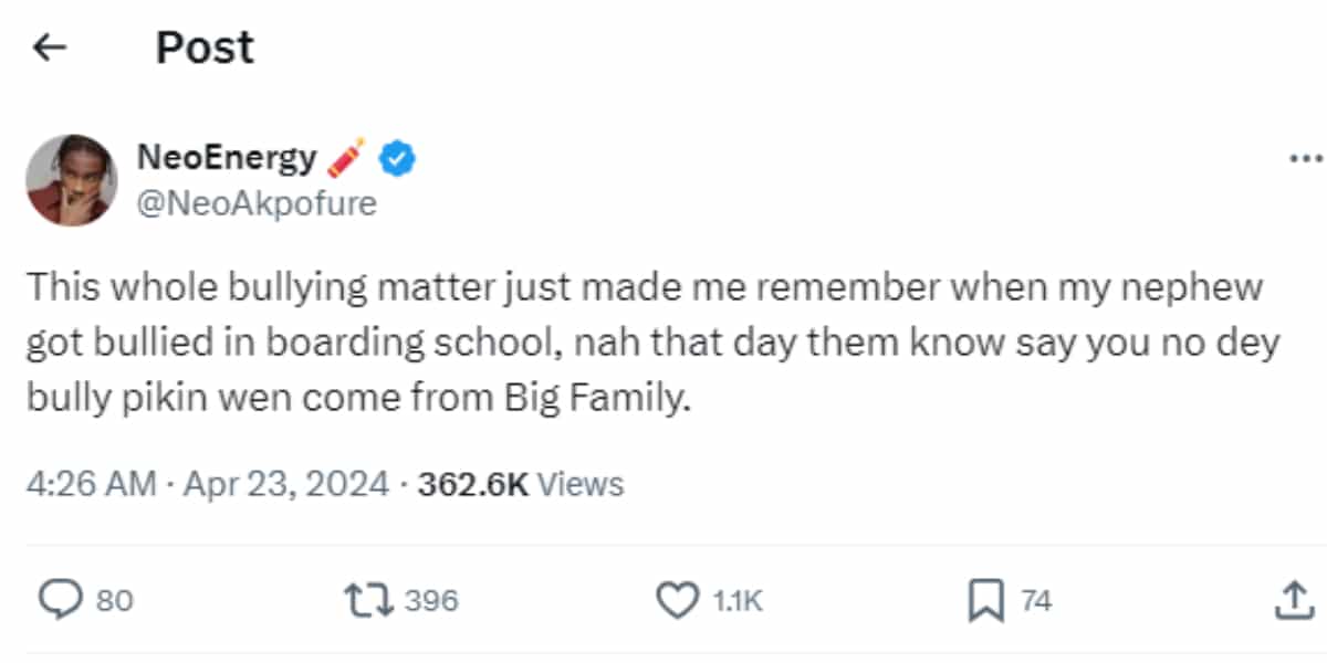 Neo Akpofure took to his Twitter page to share his opinion about how people bully their colleagues at school. Neo shared how a cousin was bullied at the boarding school. But because the Akpofures are rich and powerful, the matter was sorted.