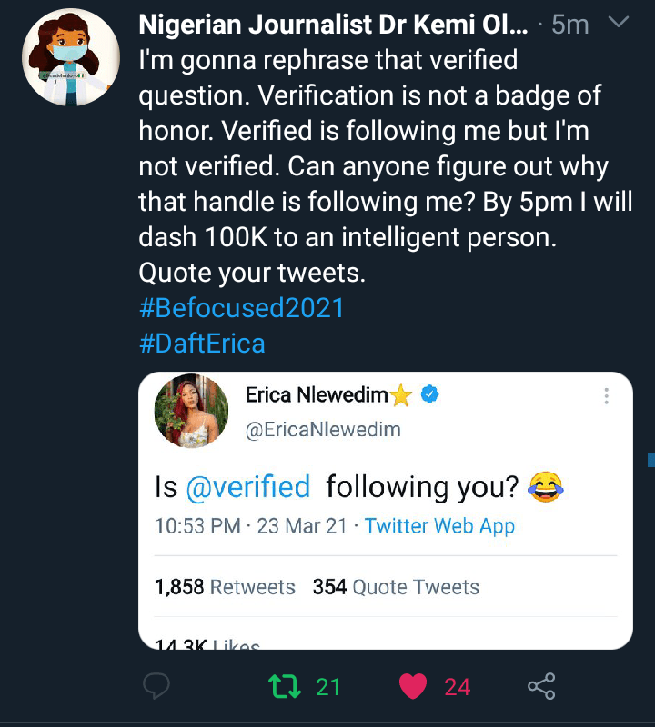 Nigerian controversial journalist, Kemi Olunloyo has lashed out at Big Brother Naija star, Erica Nlewedim for celebrating her Twitter verification.