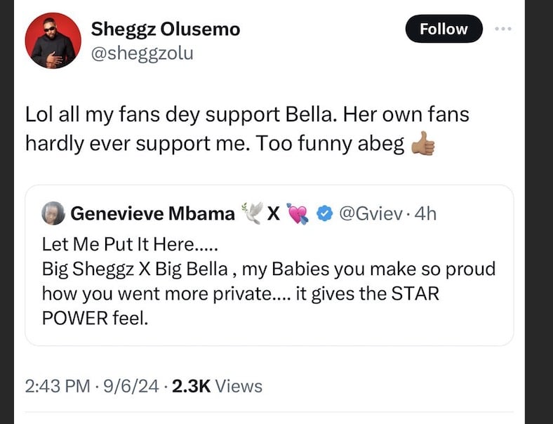 Big Brother Naija reality star, Sheggz Olusemo blasts his girlfriend, Bella’s fans for always turning a blind eye to him despite the support she gets from his fanbase.