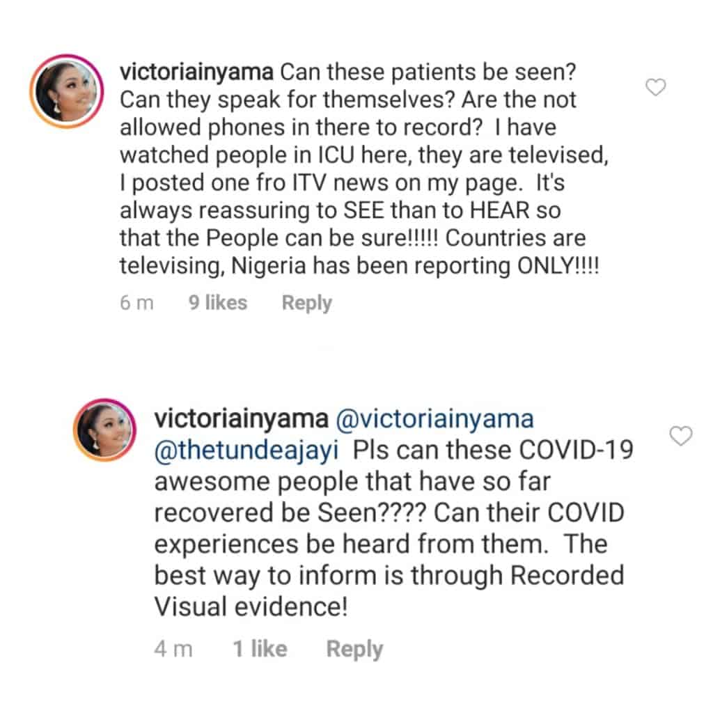 Victoria Inyama questions why those reported to have recovered from coronavirus haven’t spoken out about their struggles with the deadly disease