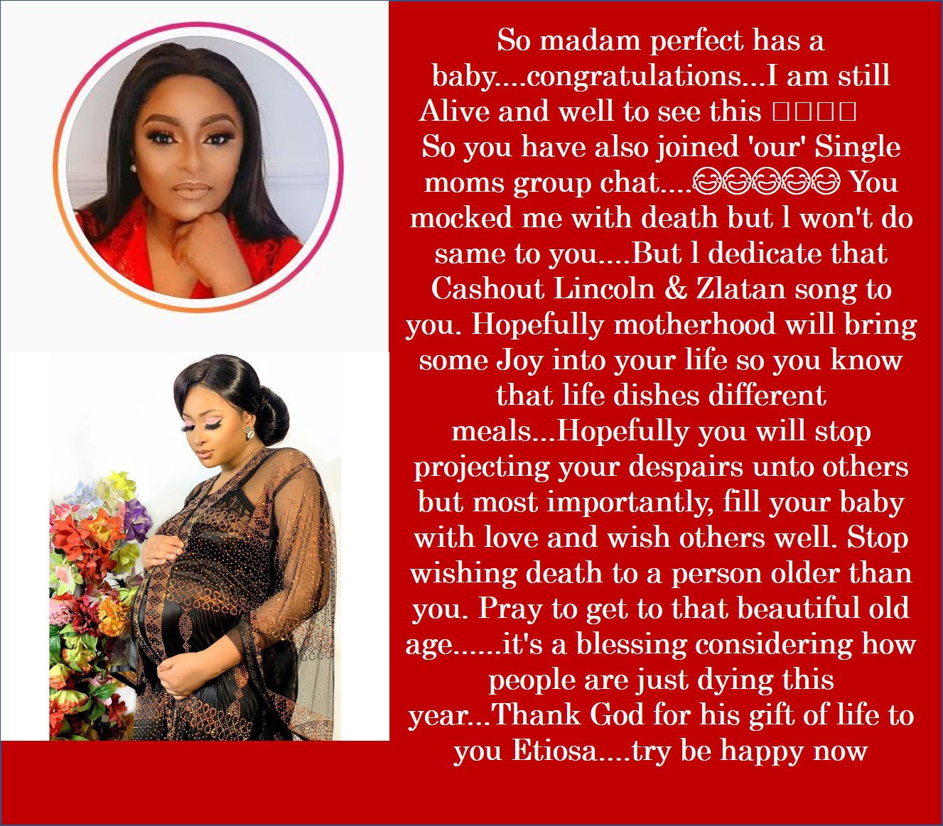 Victoria wrote, “So madam perfect has a baby….congratulations…I am still Alive and well to see this So you have also joined ‘our’ Single moms group chat…. You mocked me with death but l won’t do same to you….But l dedicate that Cashout Lincoln & Zlatan song to you.