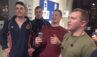 The video shows white British soldiers singing the anthem ‘Arise, O Compatriots’ in unison.